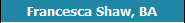 For entertainment Francesca enjoys traveling, live concerts, and art projects. She has traveled to Chile and Peru, and this spring enjoyed a visit to the small town in Jamaica where her father served in the Peace Corps.