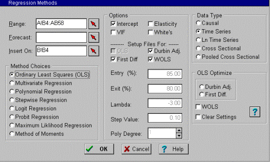 The regression dialog screen appears: